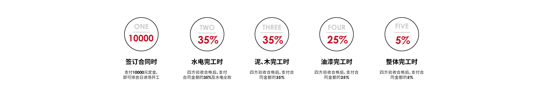 堅(jiān)持真正的先裝修,后付款。簽訂合同時(shí)只需支付10000元的定金即可進(jìn)場(chǎng)開工,根據(jù)施工進(jìn)度進(jìn)行階段款支付,更放心,更安心。