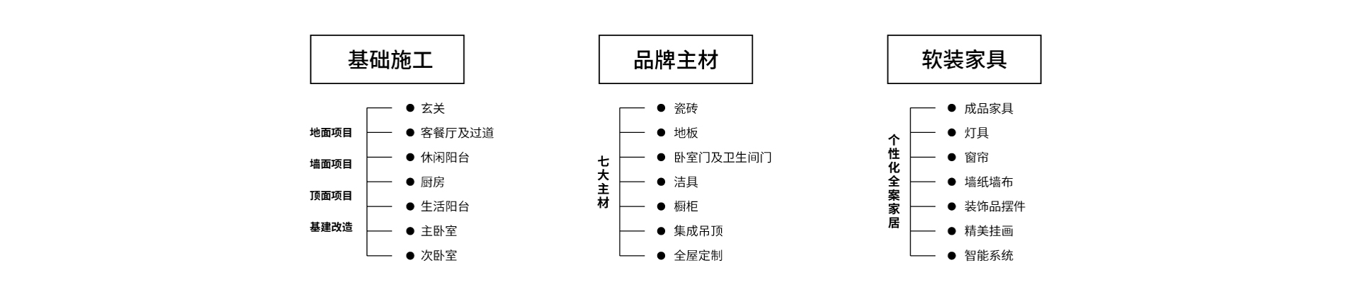 清單式個(gè)性化全案整裝,根據(jù)設(shè)計(jì)方案確定每個(gè)空間的施工項(xiàng)目,并最終計(jì)算出總價(jià),更簡(jiǎn)單,更全面,更透明。